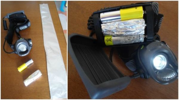 Έστω πως ο φακός κεφαλής που έχουμε έσβησε και χρειάζεται τρεις μπαταρίες τύπου ΑΑ για να λειτουργήσει ξανά, όπως και ο δικός μου, αλλά εμείς έχουμε μόνο δύο ή μία μαζί μας για να αντικαταστήσουμε. Το αλουμινόχαρτο, λοιπόν, έχει την ιδιότητα να δημιουργεί κύκλωμα με την ή τις μπαταρίες και να κάνει το φακό μας να συνεχίζει να ανάβει! Για να το πετύχουμε αυτό παίρνουμε ένα μεγάλο κομμάτι αλουμινόχαρτο και το διπλώνουμε στη μέση ξανά και ξανά μέχρι να δημιουργήσουμε μια μεγάλη λωρίδα από αυτό που το πλάτος της θα είναι όσο το ύψος της μπαταρίας μας. Έπειτα διπλώνουμε στη μέση τη λωρίδα αυτή μέχρι να γίνει ένα μικρό κομμάτι που μπορούμε να τυλίξουμε ευκολότερα. Η “μπαταρία” μας είναι έτοιμη να κάνει τη δουλειά της!