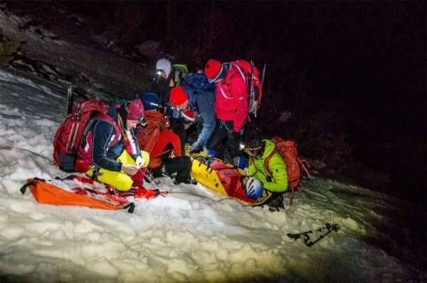 Αργότερα, όταν πια είχε νυχτώσει, μας συνάντησε μια δεύτερη ομάδα από εθελοντές της ΕΟΔ. Ο ένας από αυτούς ήταν ο υπεύθυνος του καταφυγίου της Πετρόστρουγκας, ο οποίος είχε φέρει μαζί του ένα πιο σταθερό φορείο για είμαι πιο άνετα και πιο ζεστά. Η κατάβαση μόνο εύκολη δεν ήταν και γι’ αυτό κράτησε αρκετές ώρες…