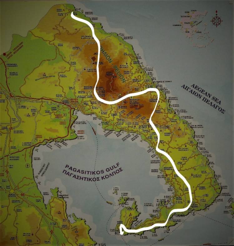 Η αφετηρία λοιπόν δίνεται από το πιο βόρειο χωριό του Πηλίου και της Μαγνησίας το Κεραμίδι. Από εκεί βαδίζουμε στο Βένετο, συνεχίζουμε στο Μοναστήρι στο Φλαμπούρι, και συνεχίζοντας περνάμε από το Τρανό Ίσωμα και φτάνουμε στη Μακρινίτσα. Συνεχίζουμε στην Πορταριά, ανηφορίζουμε στα Χάνια, και από στην κορυφή Αγριόλευκες, στην κορυφή Σχιτζουράβλι μέχρι και την παραλία στον Άγιο Ιωάννη και τη Νταμούχαρη (μέρος 1ο, απόσταση 90 χλμ).