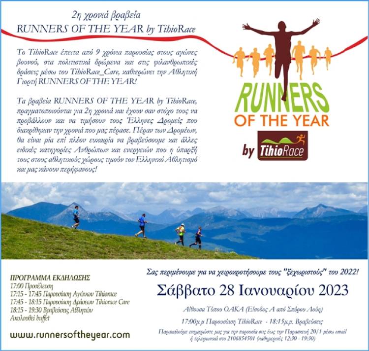 Για 2η χρονιά το Tihio Race θέλοντας να επιβραβεύσει και να αναδείξει τους Έλληνες αθλητές δρομείς, θα πραγματοποιήσει την εκδήλωση Runners of the Year και τις βράβευσης αυτών των αθλητών με γνώμονα τις επιδόσεις τους μέσα στην χρονιά του 2022.