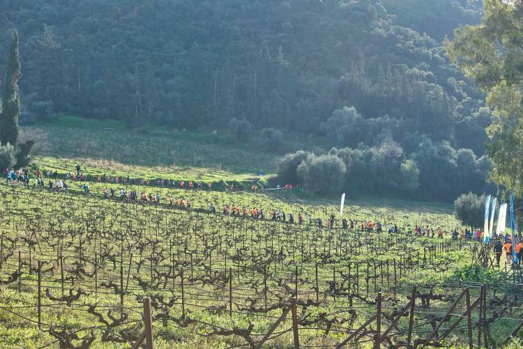 Βγαίνουμε από την πύλη και τρέχουμε το πρώτο κομμάτι εντός του αμπελώνα. Ακολουθούμε τη σήμανση και στα μισά του αμπελώνα στρίβουμε δεξιά προς το ρέμα του Φίλιουρα. Εδώ αρχίζει η πρώτη ανηφόρα που θα διαρκέσει για 6 χλμ.