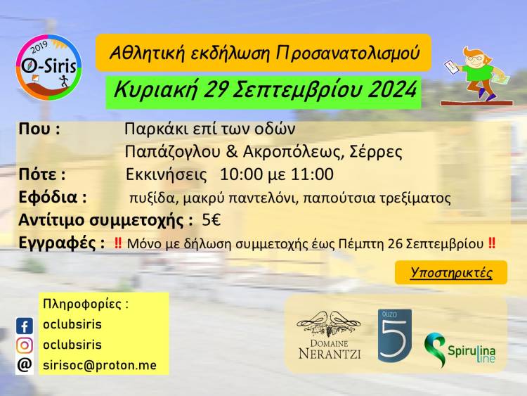 Ο σύλλογος αθλητικού προσανατολισμού Σερρών ‘Ο-Σίρις’ διοργανώνει αθλητική εκδήλωση προσανατολισμού (orienteering), την Κυριακή το πρωί, 29 Σεπτεμβρίου 2024 στην περιοχή του Λόφου Ακρόπολης Σερρών, στις Σέρρες. Το σημείο συγκέντρωσης - τερματισμού (γραμματεία) θα είναι το παρκάκι επί των οδών Παπάζογλου & Ακροπόλεως, λίγο παραπάνω από την παλιά Μητρόπολη Σερρών. Διαθέσιμο Parking για όσους έρθουν από μακριά επί τις οδού εξοχών.