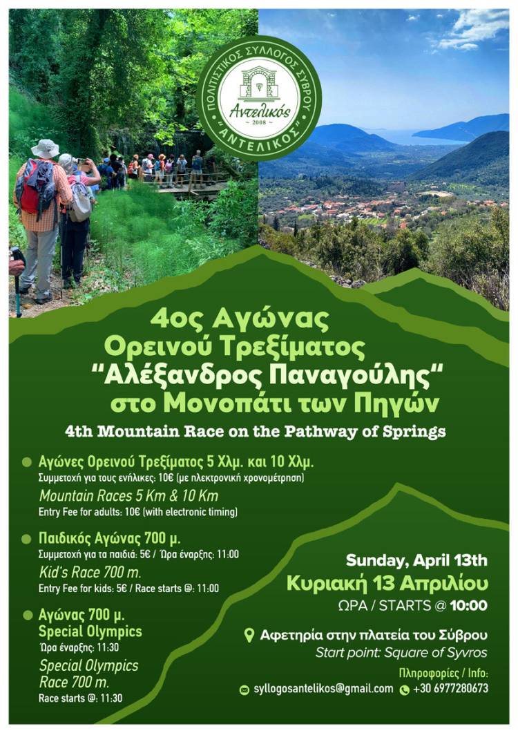 Ο Πολιτιστικος συλλογος ¨ΑΝΤΕΛΙΚΟΣ¨, διοργανώνει τον 4ο αγώνα Ορεινού τρεξίματος ΑΛΕΞΑΝΔΡΟΣ ΠΑΝΑΓΟΥΛΗΣ ΣΤΟ ΜΟΝΟΠΑΤΙ ΤΩΝ ΠΗΓΩΝ την Κυριακή 13 απριλιου 2025.