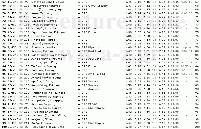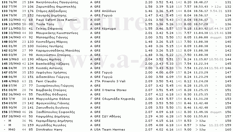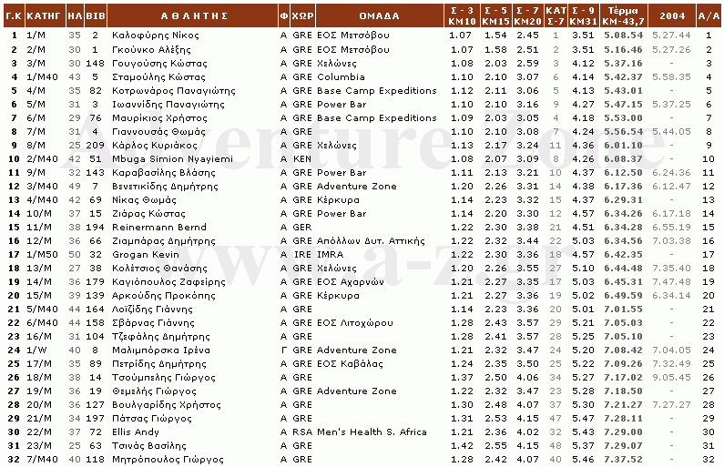 Το Α-Ζ παρουσιάζει τα αναλυτικά αποτελέσματα του Olympus Marathon 2005. Μετά από επισταμένη εργασία αρκετών ημερών, επεξεργάστηκαν τα τελικά αποτελέσματα αλλά και τα επιμέρους ενδιάμεσων Σταθμών του αγώνα με σκοπό να δημιουργηθεί ένας πίνακας που θα προσφέρει λεπτομερή στοιχεία και θα βοηθήσει τους αθλητές που συμμετείχαν, να βγάλουν χρήσιμα συμπεράσματα. Στον τελικό αυτό πίνακα παρουσιάζεται πλήθος παραμέτρων για τον κάθε αθλητή, όπως η θέση του στη γενική κατάταξη, στην ηλικιακή του κατηγορία, τέσσερις ενδιάμεσοι χρόνοι (στους Σταθμούς 3, 5, 7 και 9), η προσωρινή κατάταξη του κάθε αθλητή στο ψηλότερο σημείο της διαδρομής (Σταθμός-7) στο 20ο χιλιόμετρο, όπως επίσης και η επίδοσή του στην περσινή πρώτη διοργάνωση -για όσους συμμετείχαν. Ο πίνακας έχει μεγάλο πλάτος (800 pixels) με αποτέλεσμα ο επισκέπτης να πρέπει να χρησιμοποιήσει και οριζόντια μπάρα κύλισης (scroll bar) ώστε να δει το σύνολο των πληροφοριών για τον κάθε αθλητή -ειδικά όσοι χρησιμοποιούν ανάλυση οθόνης 800Χ600. Σχετικό υπόμνημα με επεξηγήσεις των περιεχομένων του πίνακα υπάρχει στο τέλος του πίνακα, όπως επίσης και γλωσσάρι όρων. Ο πίνακας παρουσιάζεται σαν αρχείο εικόνας ώστε να μειωθεί το μέγεθος αρχείου στο ελάχιστο για λόγους ταχύτητας ανταπόκρισης