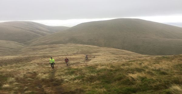 Τα σύννεφα είχαν αρχίσει να μας ενοχλούν, καθώς ήταν πολύ χαμηλά, απειλώντας για βροχή. Φτάσαμε στην πρώτη κορυφή, όχι ιδιαίτερα υψηλή, γύρω στα 680m. H ομίχλη ήταν πολύ πυκνή, τέτοια που σε δυσκόλευε να εντοπίσεις τον μπροστινό σου εύκολα. Η πυκνή λάσπη, το γρασίδι και οι καλά κρυμμένες λακούβες, δυσκόλευαν όλο και περισσότερο το έργο μας. Πρώτη κορυφή, με πολλές στάσεις για φωτογραφία και πολύ περισσότερες τούμπες. Επιτέλους, κατηφόρα! Βάζω το κινητό μου μέσα και ετοιμάζομαι για μια γρήγορη κατάβαση. Τα γλιστρίματα έρχονταν το ένα μετά το άλλο, καθόλου συνηθισμένος σε τέτοια τερέν, οι ‘συνοδοιπόροι’ μου γνήσιοι fell-runners κατέβαιναν δίχως καμία ανησυχία. Έμεινα πίσω, παρακαλώντας να τελειώσει η κατηφόρα.