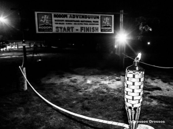 …αφού η μέρα εξελίχθηκε πράγματι ιδανική για αγώνα! Οι καλές για την εποχή θερμοκρασίες και η απουσία του ήλιου κατά την μεγαλύτερη διάρκεια της πρώτης ημέρας ήταν ένας σύμμαχος για όλους. Παλαιότερα είχαμε μνημονεύσει τον ουράνιο θόλο της Ροδόπης ο οποίος στο απόλυτο σκοτάδι φανερωνόταν από πάνω μας σαν ένας μαγικός πίνακας με αμέτρητες πινελιές. Φέτος τα πράγματα ήταν αρκετά διαφορετικά για το μεγαλύτερο διάστημα της νύχτας στα ψηλά του αγώνα. Πάνω από τα 1.000 μέτρα περίπου η πυκνή ομίχλη δημιούργησε ένα απίστευτα μυστηριακό σκηνικό. Δεν ήταν λίγες οι φορές που χρειάστηκε να κρατάμε τον φακό στα χέρια για να μπορούμε να διακρίνουμε καλύτερα τα επόμενα μέτρα μπροστά μας... Θα μείνει για πάντα χαραγμένη στην μνήμη μας η εικόνα καθώς πλησιάζαμε το σημείο ελέγχου της Πυραμίδας -148 στην μέση του αγώνα η αύρα φωτός που δημιουργούσε η μεγάλη φωτιά που είχαν ανάψει οι ηρωικοί εθελοντές που με υπομονή μας περίμεναν να μας ζεστάνουν λίγο πριν πάρουμε το κατηφορικό μονοπάτι.